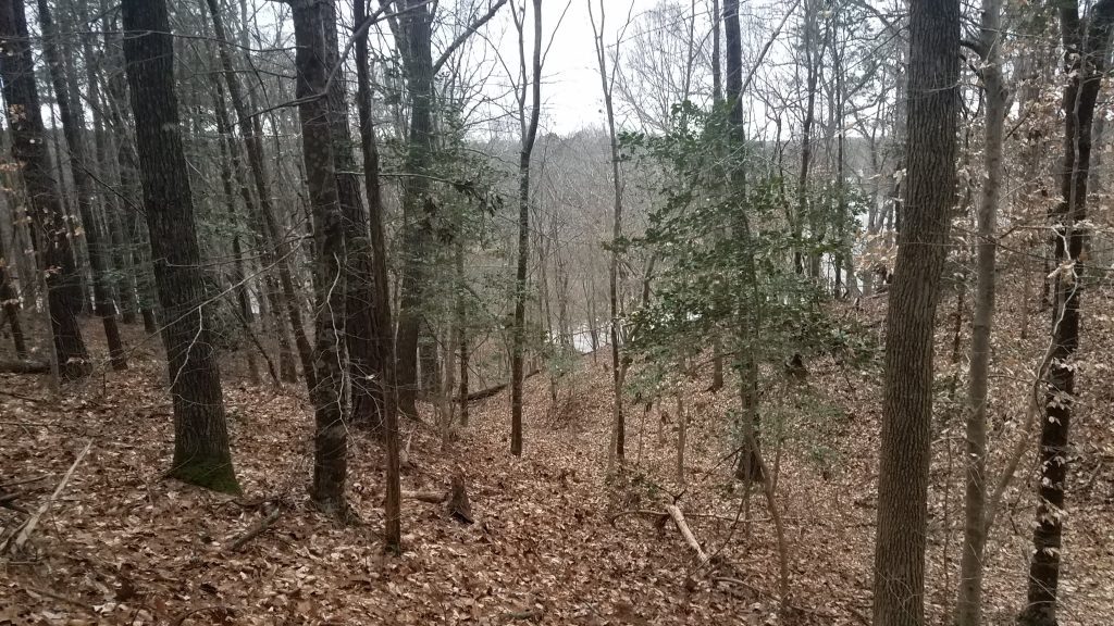 the general angle of approach, and after scanning past trees and pushing aside branches, I saw another white mark. My cell phone rang; my husband, who had explored the side path until being attacked by thorny branches, asked where I was and if I’d found the trail. I told him to come back to where it split. We had the general trajectory, and spent the next fifteen minutes walking a little way, then again reexamining our direction, starting to move forward, then searching for another marker, or an alternative way to get past briers and muddy trickles of water. In some areas where there were a couple of seemingly viable options, markers were placed closer together and helped us choose the correct route. Occasionally we would pull out the GPS to see if we were headed in the right general direction, even though the path itself was not visible on the map.